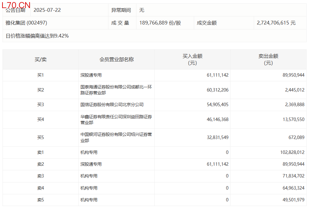 雅化集团今日涨停,有4家机构专用席位净卖出2.89亿元