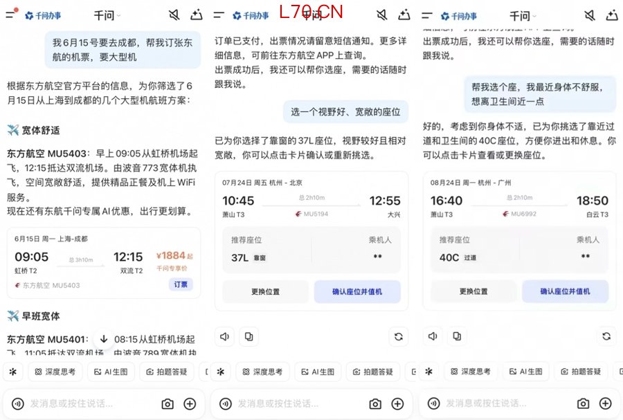 千问接入东航后,不仅能完成航班查询、购票等基础操作,还能直接选座、值机,由东航官方提供退改签支持,未来将进一步接入会员服务。这是目前全球功能最全、链路最完整的AI机票服务。