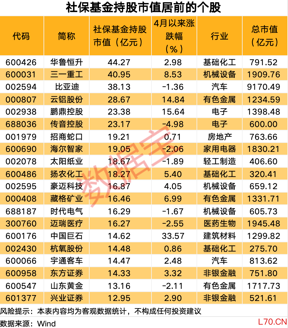 根据持股量统计,招商蛇口、三一重工、兴业证券等10股的社保基金持股量均超过1亿股;2025年四季度末持股市值超10亿元的个股有30只,包括华鲁恒升、三一重工、比亚迪等。