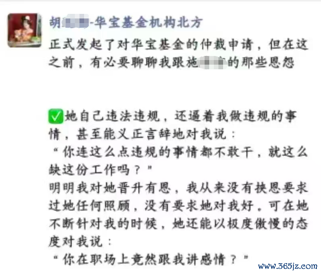 据胡某自述,她已正式向华宝基金发起仲裁申请,主张被克扣的工资、年终奖以及精神和身体伤害的补偿,并强调自己掌握了对方违规的证据。