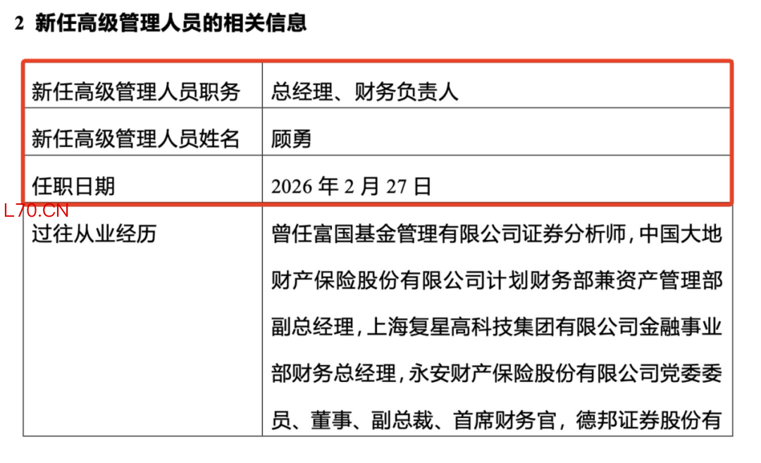 公开资料显示,顾勇曾任富国基金管理有限公司证券分析师,中国大地财产保险股份有限公司计划财务部兼资产管理部副总经理,上海复星高科技集团有限公司金融事业部财务总经理,永安财产保险股份有限公司党委委员、董事、副总裁、首席财务官,德邦证券股份有限公司高级总裁助理兼科技金融部总经理、副总裁,华安证券股份有限公司副总裁、东财基金管理有限公司副总经理。