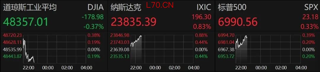 截至发稿,道指跌0.37%,纳指涨幅扩大至0.83%,标普500指数涨0.33%。