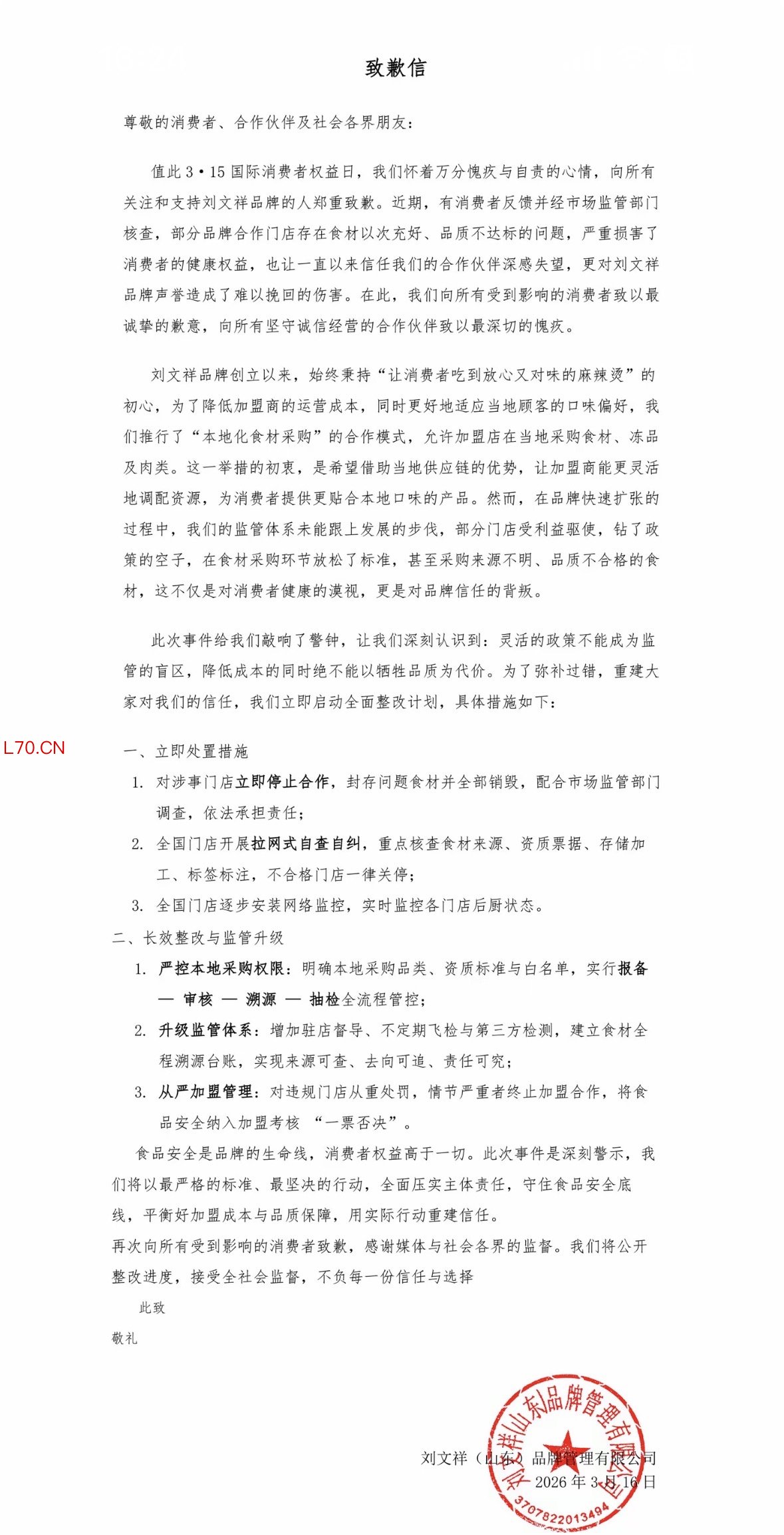 刘文祥发布致歉信:对涉事门店立即停止合作,全国门店开展拉网式自查自纠